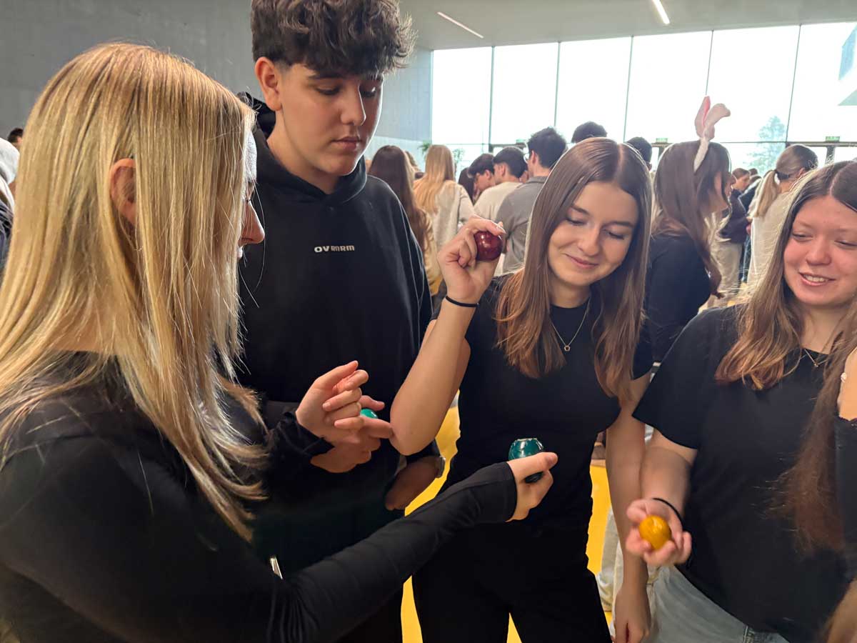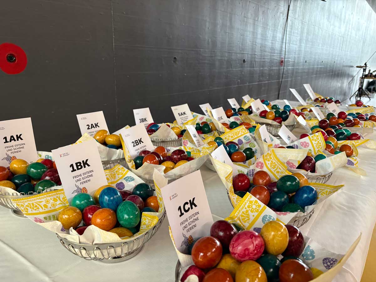 Zum Ostereierpeck-Wettbewerb versammelten sich 500 Schüler:innen, Lehrkräfte und Gäste der HAK HLW Kirchdorf vor den Osterferien in der Aula. Mit unterschiedlichsten Techniken wurde zunächst der Klassensieg im Eierpecken ermittelt, bevor man sich um den Schulsieg matchte. Schwungvoll von Musiker:innen begleitet, erhielten alle Personen auch frisch gebackene Mürbteig-Haserl. Zusätzlich waren Schüler:innen auf der Suche nach einem versteckten Osterei, was der Siegerklasse Zimtschnecken in Klassenstärke einbrachte. Eine gelungene Veranstaltung, die dank der Professor:innen Sehr, Ringhofer-Schneeweiß und Schedlberger sowie vieler fleißiger Hände den Teamgeist der Schulgemeinschaft stärkte.