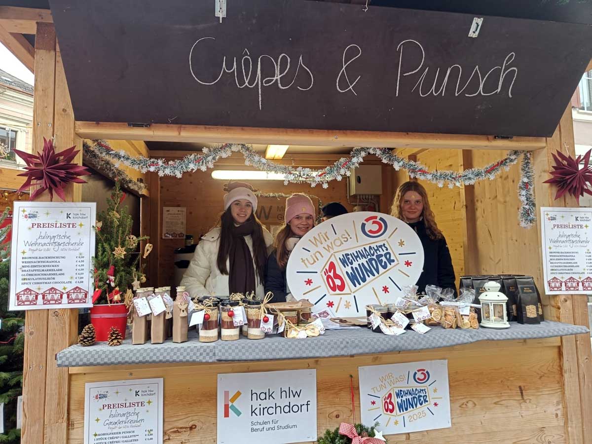 Gutes zu tun und in Not geratene Menschen zu unterstützen, war die Grundidee der Schüler:innen der 2A HLW. Deshalb entwickelten sie mit ihrer Lehrkraft, Claudia Kinbacher-Mitterhuber, kulinarische Genüsse zur Weihnachtszeit, die beim Kirchdorfer Adventzauber am 4. und 5. Dezember verkauft werden. Im Kochunterricht wurden Backmischungen, Mini-Zimtschnecken, Spekulatius-Likör, Spicy Chocolate, Weihnachtsgranola, Bratapfelmarmelade produziert, auch frische Crepes und Punsch werden am Stand angeboten.